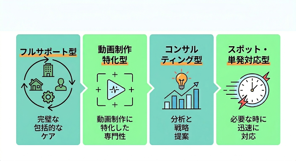 フルサポート型・動画制作特化型・コンサル型・スポット型のどれが自社に適しているかは、社内リソースと目的によって異なる