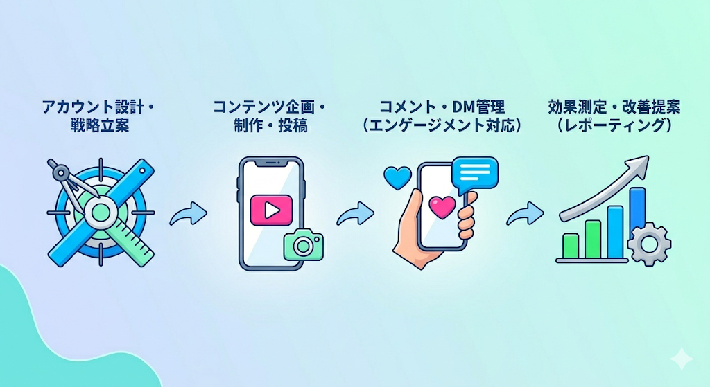 単なる「投稿代行」とは異なり、戦略設計から運用のPDCAサイクル全体を外部の専門チームが担う点が最大の特徴です。